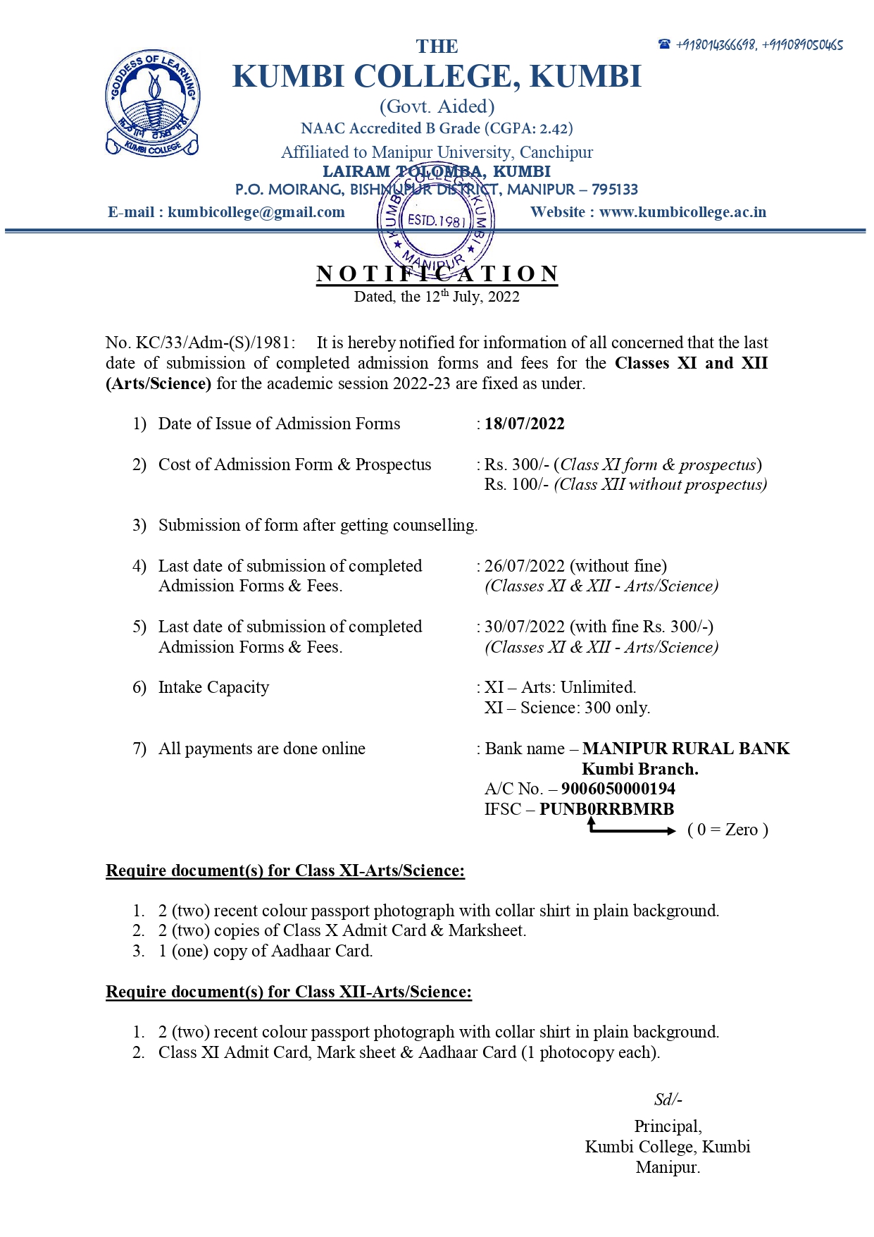 > Admission Notification for Classes XI & XII (Arts/Science) for the academic session 2022-23