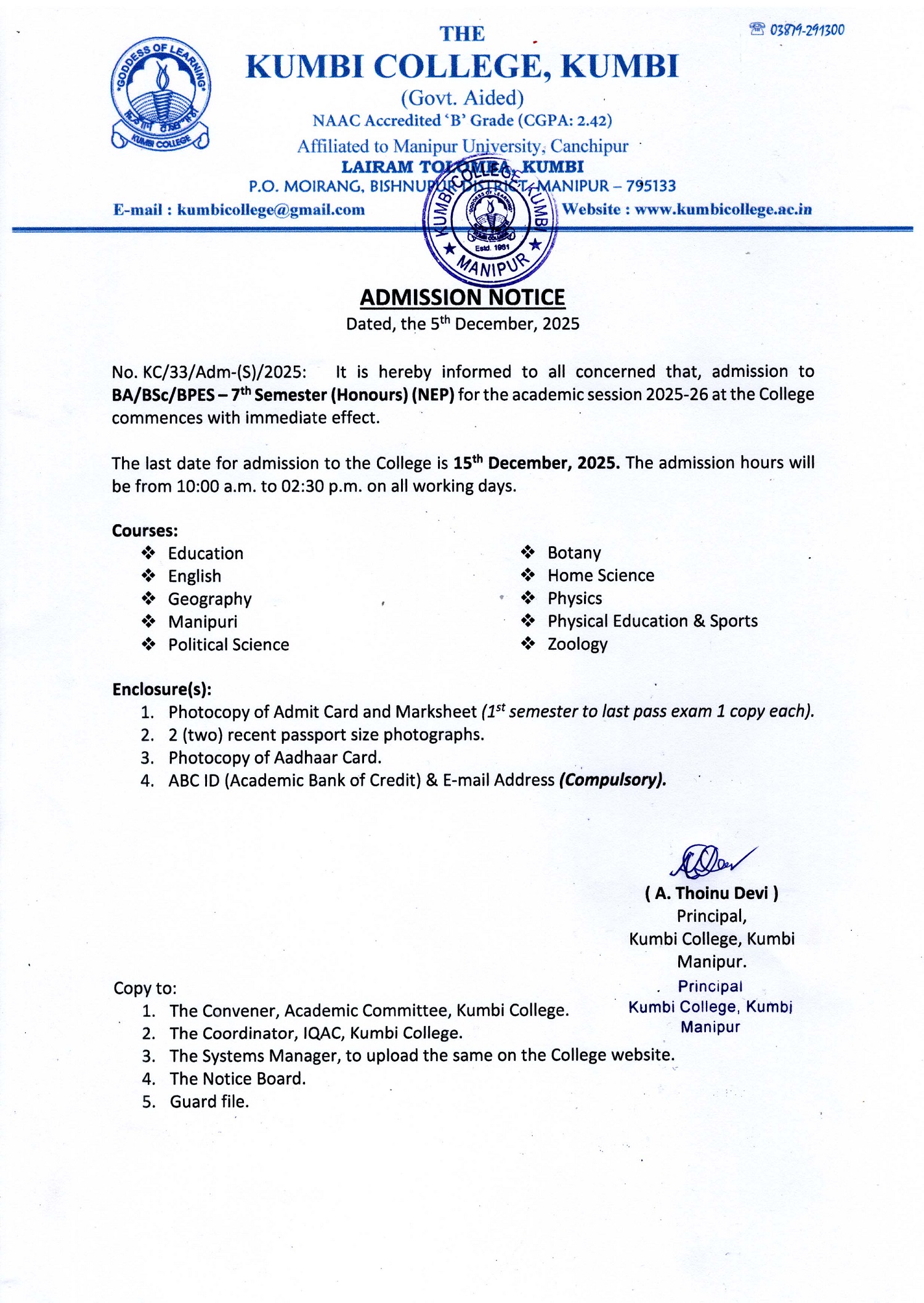 > Notification for Admission to BA/BSc/BPES – 7th Semester (Hons.)(NEP) academic session 2025-26
